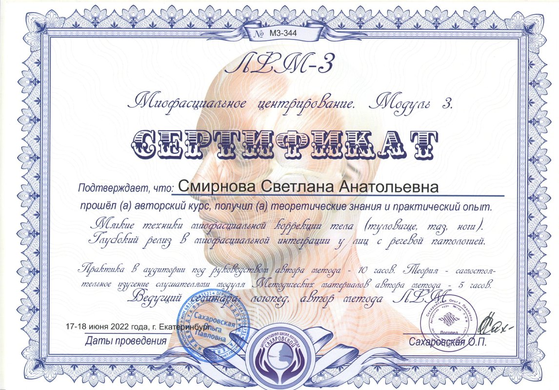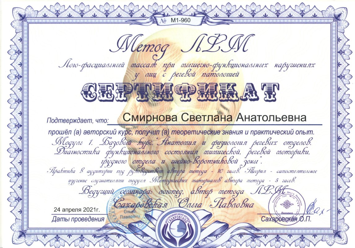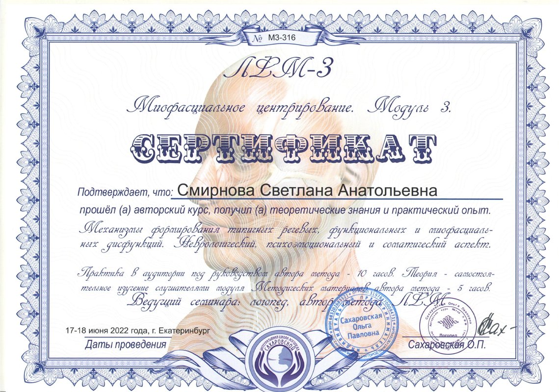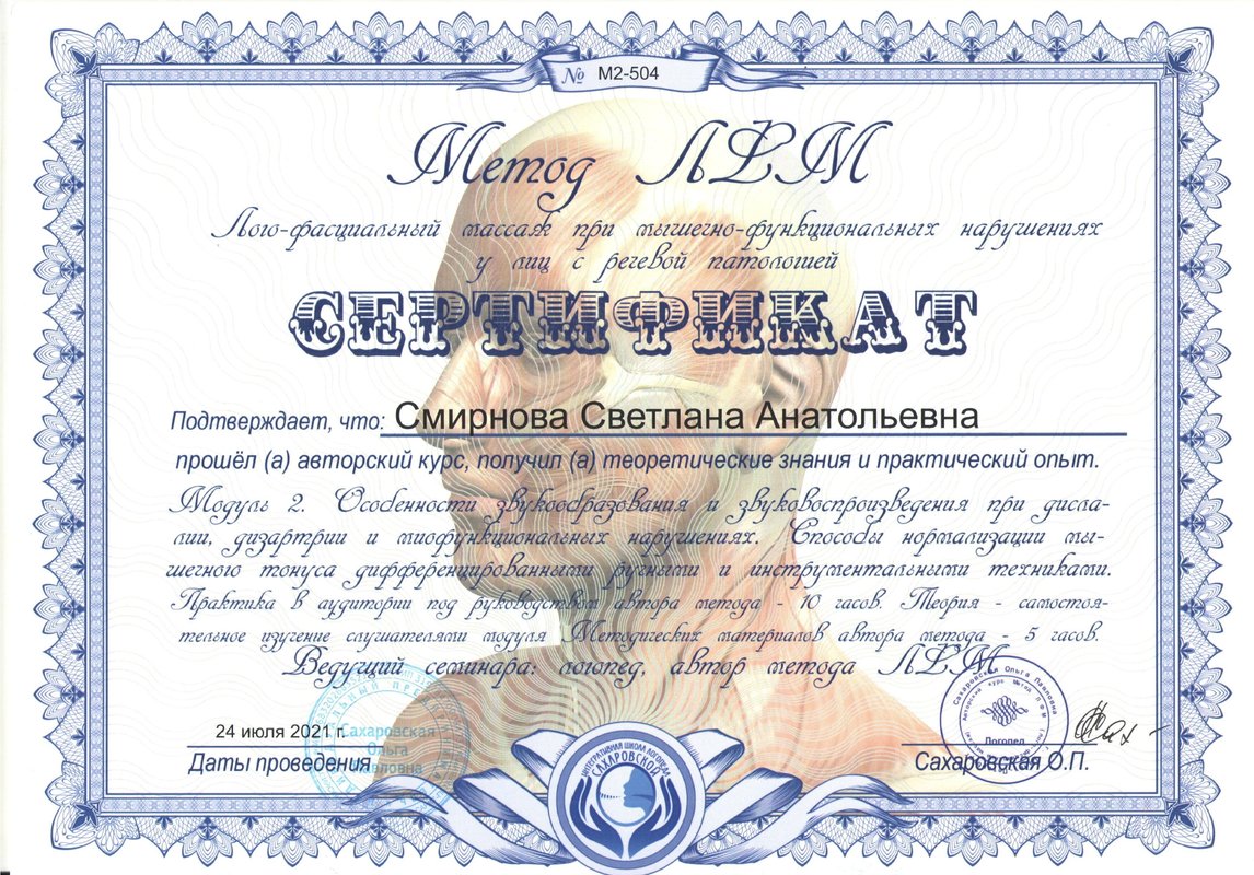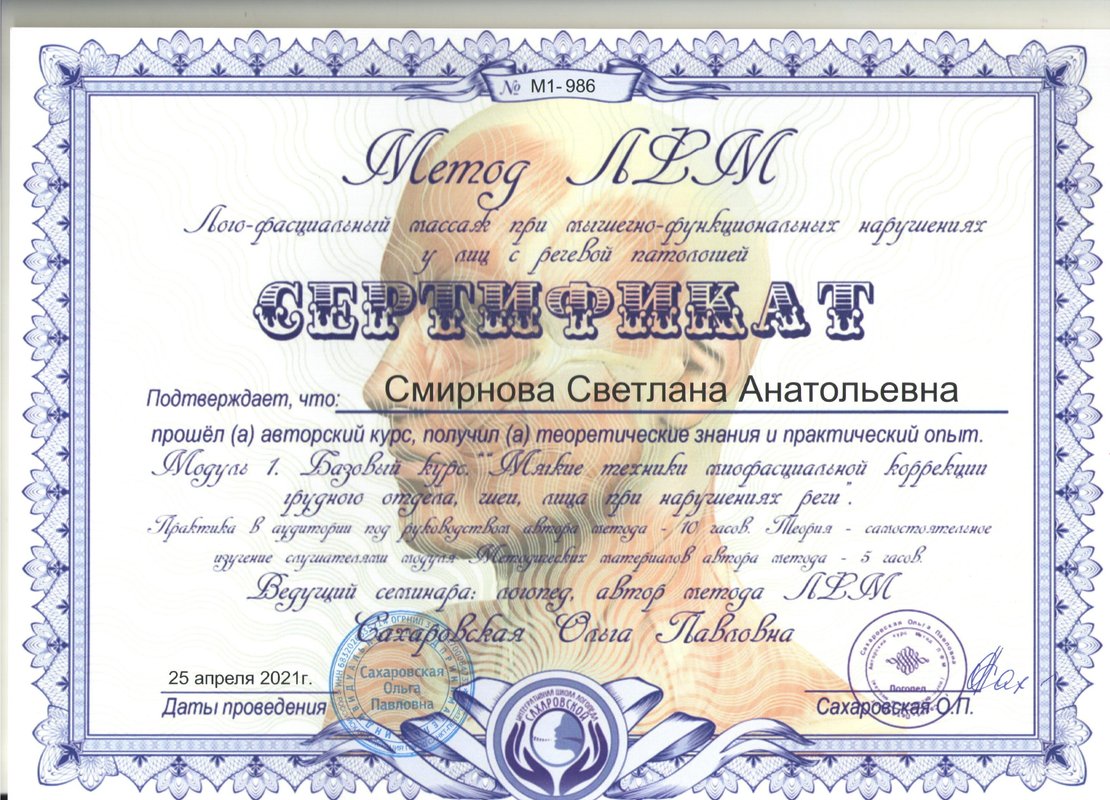 Проводит логофасциальный массаж (ЛФМ) по методике О.П. Сахаровской, находится в реестре специалистов.